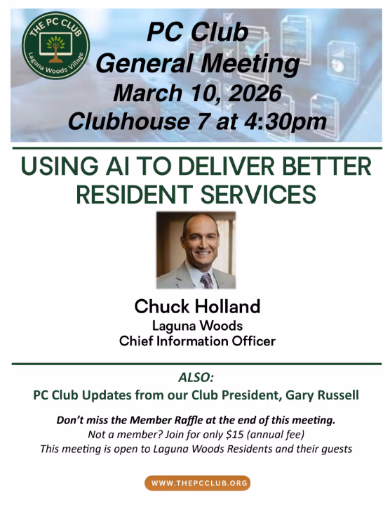 The PC Club Tax Program is now open for Tax Return Filing and operates Tuesday, Wednesday and Thursday on the third floor of the Community Center. For more information contact Taxes@thepcclub.org or call 949-391-9718 and leave a message.